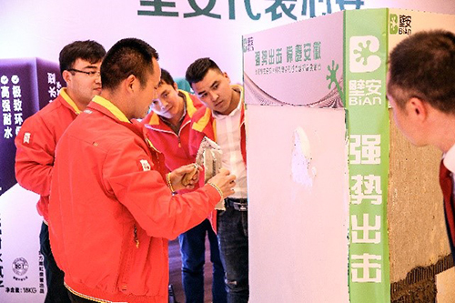 民建公司高級(jí)產(chǎn)品經(jīng)理潘佳對(duì)壁安全品類產(chǎn)品做詳細(xì)介紹。大會(huì)共發(fā)布壁安產(chǎn)品21種,涵蓋瓷磚膠、膩?zhàn)臃邸⒔缑鎰⒍侣殹⑻羁p劑、防水等品類。為更好地展示產(chǎn)品性能,合肥當(dāng)?shù)刂吖ざ艓煾岛鸵庀蚩蛻衄F(xiàn)場(chǎng)對(duì)部分產(chǎn)品進(jìn)行試刷,并邀請(qǐng)與會(huì)嘉賓上臺(tái)感受產(chǎn)品的施工體驗(yàn)。