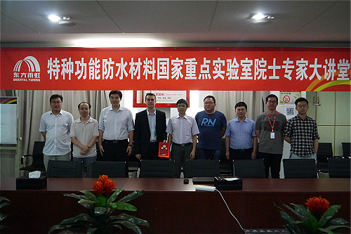 6月12日下午,應特種功能防水材料國家重點實驗室邀請,法蘭西大學研究院院士,法國特等教授Christophe Thomas博士參觀訪問東方雨虹國家重點實驗室,并作題為《雜環(huán)單體聚合:一種簡單的生物基聚合物可控聚合方法》的學術報告。報告會由東方雨虹集團產(chǎn)品研發(fā)中心主任助理郭嘉博士主持,特種功能防水材料國家重點實驗室主任段文鋒以及東方雨虹研發(fā)系統(tǒng)百余名技術人員聆聽了本次報告。