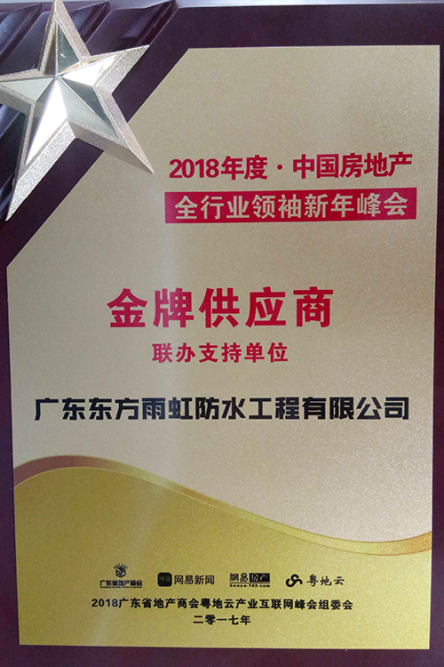 1月12日,由廣東省地產商會、網易房產聯合主辦的“2018中國房地產全行業領袖新年峰會暨中國地產冠軍榜及粵地云產業互聯網峰會”在廣州南豐朗豪酒店隆重舉行,約500多名政府部門人員、行業高層等出席本次會議,廣東東方雨虹總經理孫福琴應邀出席。廣東東方雨虹防水工程有限公司榮獲2018年度·中國房地產“金牌供應商”榮譽稱號。