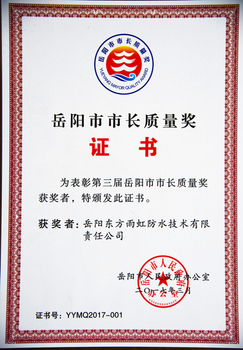 岳陽東方雨虹榮獲岳陽市市長質量獎