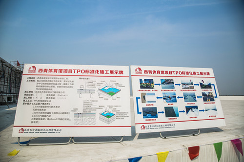 會議結束后,雙方一起參觀了天津市西青體育館施工現場,易帥就施工要點及細部節點為設計師們進行逐一講解,得到了院方對東方雨虹TPO單層屋面防水系統的認可,為雙方進一步開展友好交流合作奠定了基礎。