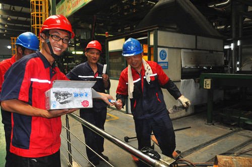 炎炎盛夏,熱浪滾滾,連日來,徐州市氣溫節節攀升,最熱時氣溫高達38度,驕陽似火,酷暑難耐。但東方雨虹的一線員工們依然堅守在崗位上,用他們的汗水確保公司的生產活動順利進行。 7月26日、27日,東方雨虹徐州生產基地組織辦公室所有員工帶著公司的關懷,來到車間,給一線員工們送去了清涼解暑的綠豆湯、冰棍和冰鎮西瓜。雖然汗水已經把大家的衣衫浸透,但炎炎夏日擋不住彼此的關愛和笑容,一次次傳遞,一聲聲辛苦,在送去涼爽的同時,也溫暖了員工們的心。