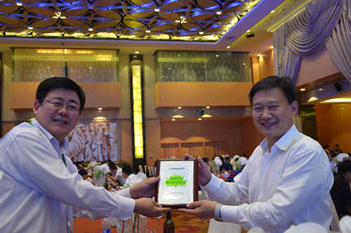 朗詩綠色地產(chǎn)董事長田明(右)向江蘇臥牛山公司副總秦峰濤頒發(fā)獎(jiǎng)牌