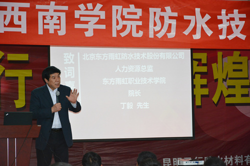 接著,東方雨虹職業技術學院副院長彭作緒先生介紹本次培訓的課程安排,為期四天的培訓將由“2015聯盟杯”優秀選手張廣輝、王巍主講,內容包括SBS改性瀝青防水卷材、高分子防水卷材、涂料等基本理論及如陰陽角、管根等施工部位實操演練的深入分析,本次理論與實操雙合格的學員也將獲得由國家建筑材料行業職業技能鑒定(指導)中心統一頒發防水工職業資格證書。