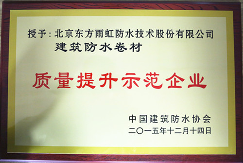 12月14日,中國建筑防水協會第七次會員大會暨“全國建筑防水行業質量提升大會”在京舉行。北京東方雨虹防水技術股份有限公司在會上被評為“質量提升示范企業”。 2015年9月,在國家質檢總局的指導下,由中國建筑防水協會聯合地方防水社團組織及骨干企業開展的建筑防水行業“質量提升萬里行”活動啟動,東方雨虹作為“建筑防水行業質量萬里行”典型單位,在會上被授予“質量提升示范企業”稱號。
