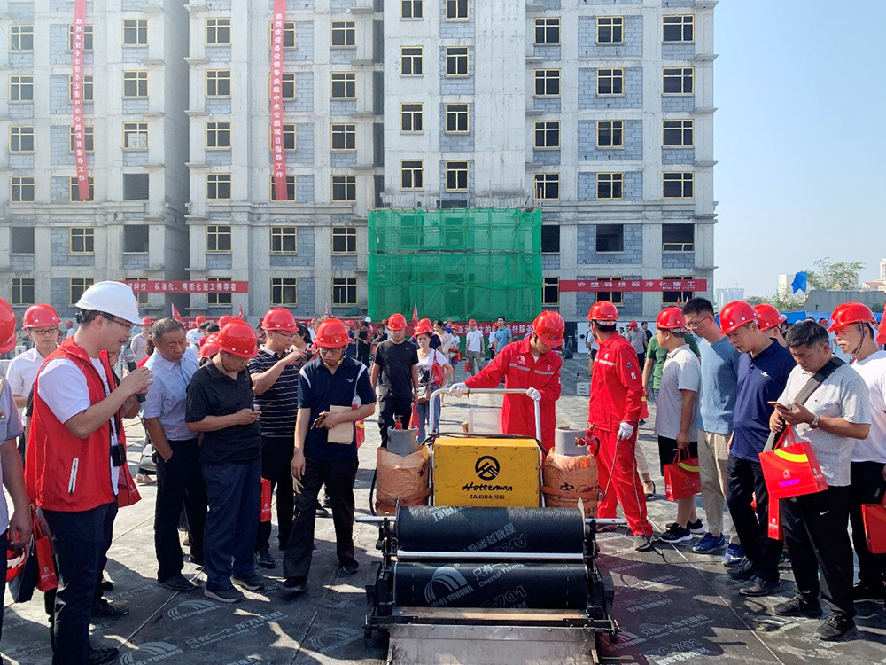觀摩會(huì)現(xiàn)場,東方雨虹工建集團(tuán)大鄭州區(qū)域總經(jīng)理朱新峰表示,濮陽東方雨虹生產(chǎn)基地的建立,立足本地,輻射并滿足周邊區(qū)域的防水需求,全面踐行“為人類為社會(huì)創(chuàng)造持久安全的環(huán)境”使命;工建集團(tuán)大鄭州區(qū)域技術(shù)副總工程師孫新磊向與會(huì)人員展示了東方雨虹各業(yè)務(wù)領(lǐng)域的高質(zhì)量產(chǎn)品和標(biāo)準(zhǔn)化施工流程,現(xiàn)場操作“虹人”“騎行者”等機(jī)械化設(shè)備,闡述了新型材料的優(yōu)勢(shì)和使用范圍。