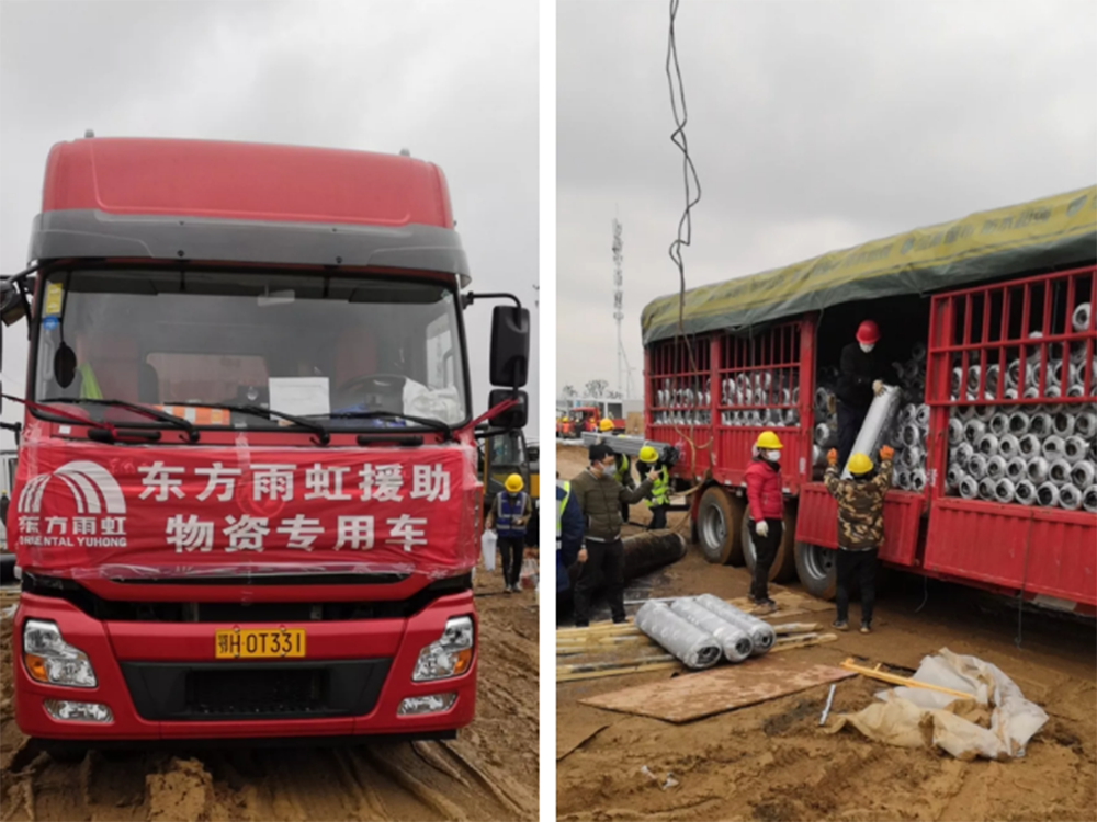 當前,湖北地區物流壓力頗大。但他們仍冒雨雪天出發,經連夜趕路,將東方雨虹馳援物資安全送入武漢雷神山醫院施工現場。到達后,更是抓緊一切時間,立刻組織卸貨、安排施工,爭分奪秒,一絲不茍,最終保質保量完成施工任務。