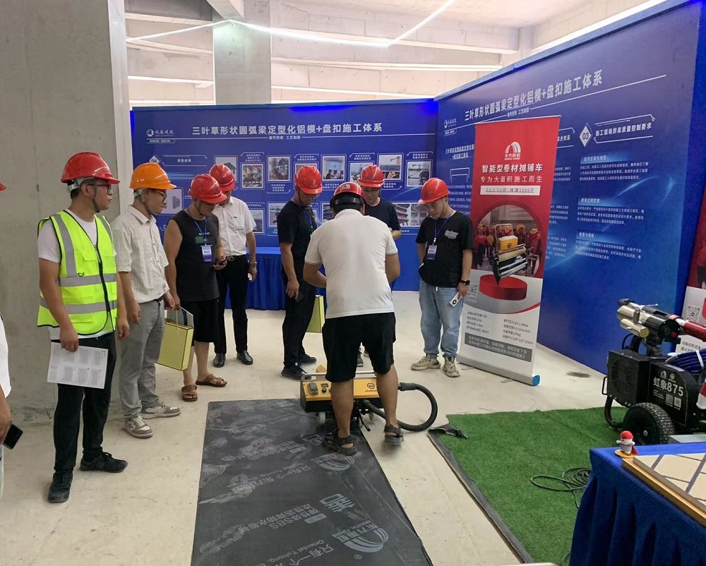 活動現場,東方雨虹技術人員詳細講解金屬屋面TPO等產品的性能優勢、環保特性及應用場景,并將材料選擇、安全規范、施工工法等影響工程效果關鍵因素融于底板、側墻、頂板防水施工打樣展示。此外,通過操作智能卷材攤鋪機、聚氨酯噴涂機等設備,全方位呈現其功能與特性,讓現場觀眾近距離感受產品的獨特性。