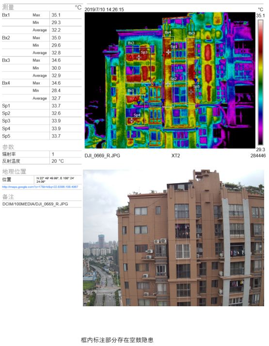 近年來(lái),隨著建筑外墻粘貼面磚的普遍采用,建筑外墻面磚粘接劑空鼓脫落現(xiàn)象也經(jīng)常發(fā)生。本文針對(duì)以下紅外熱成像儀所檢測(cè)的圖片所展現(xiàn)的空鼓問(wèn)題,提出技術(shù)方案。