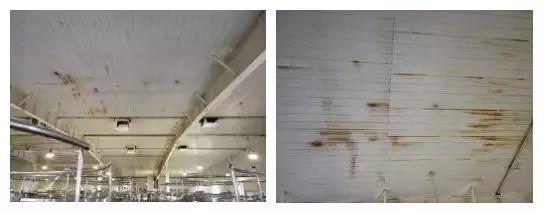 某生產車間頂棚防腐項目頂棚采用金屬板、巖棉復合鋼板,由于金屬頂棚板面防腐漆質量較差,生產車間內部溫度、濕度較高,最終導致室內頂棚金屬板銹蝕嚴重。